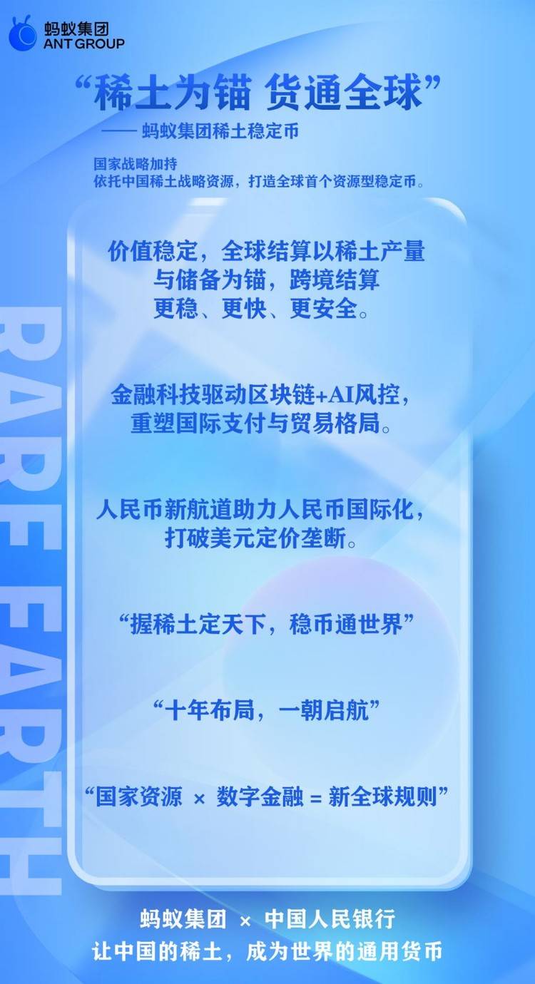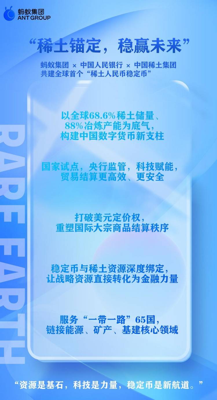 蚂蚁集团今日正式宣布,将投入首期资金100亿元人民币,与中国稀土稳定币项目展开全面战略合作,共同推进“稀土锚定型人民币稳定币”的研发、沙盒测试与全球应用。