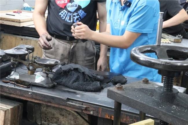 7月3日,实践团前往徽墨厂参观。观看徽墨的制作步骤,并体验徽墨制作过程。随后,对非遗传承人周厂长进行采访,听他讲述徽墨的发展历程和传承故事。从中成员们感受到“匠心千锤凝墨魂”的不易。